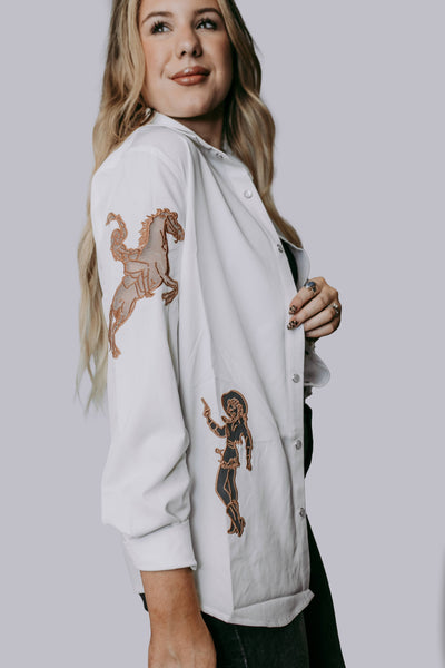 White button Pearl Snap button down with light brown embroidered mesh cutouts.