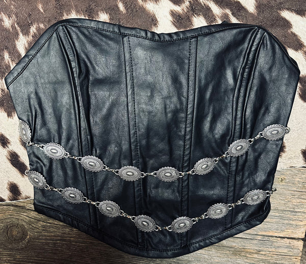 Elevate your western fashion inventory with this statement-making Black Faux Leather Strapless Corset Top.