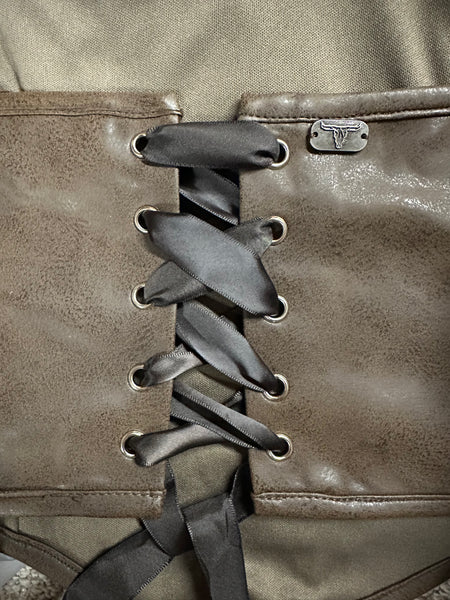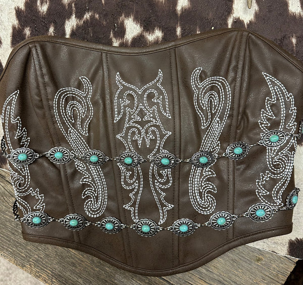 Turn up the Western glam with this stunning strapless brown suede corset top, featuring intricate white embroidery and turquoise DOUBLE concho chain detailing.