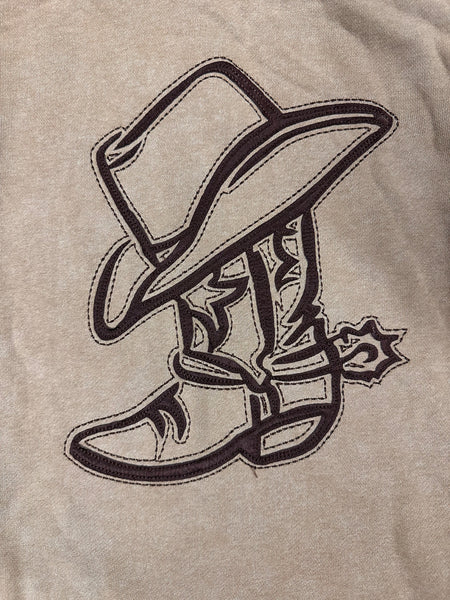 Step into Western charm with this tan sweatshirt featuring a bold, embroidered cowboy boot and hat motif across the chest.