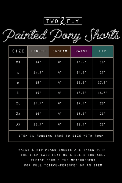 The Painted Pony Shorts from 2 Fly Co are a unique blend of Western and weird. These shorts are not just a piece of clothing, they're a part of your individuality. With our original, hand-drawn designs, you're not just wearing shorts, you're expressing yourself. Our inclusive size range from XS to 3X ensures everyone can enjoy our line. Add a little Western, a little weird, and a whole lot of style to your wardrobe today. Stay fly with 2 Fly Co!