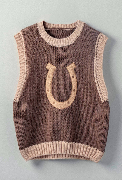 Crochet Knit Embroidered Horseshoe Sweater Vest with Ribbed Trim