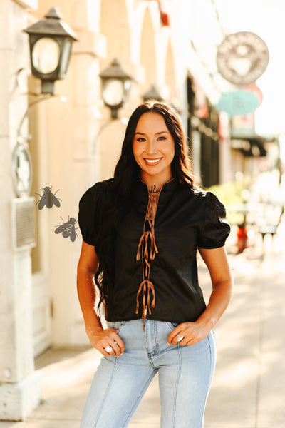 The Calhoun Top in Midnight is more than just a blouse… It's a unique piece that brings together the western, the weird, and a little bit of everything. This women's top doesn't follow trends, but rather, sets them. With its hand-drawn original designs, it's a piece you'll want to keep in your wardrobe for generations.