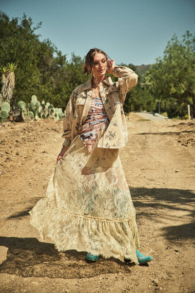 Relaxed-fit shacket with full-length sleeves, collared neckline, and flap chest pockets, featuring an allover western-inspired print. Has side pockets.