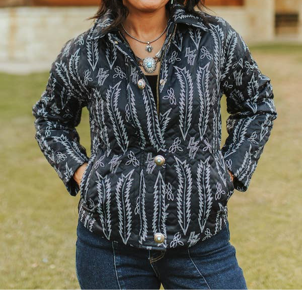 Stand out in this bold and cozy Western-inspired embroidered puffer jacket designed for the modern cowgirl. And check out those snap buttons… the turquoise detail!