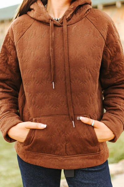 Wrap up in cozy Western comfort with this rich chocolate brown quilted pullover hoodie, designed with subtle embossed Western stitching for that authentic ranch-inspired finish.