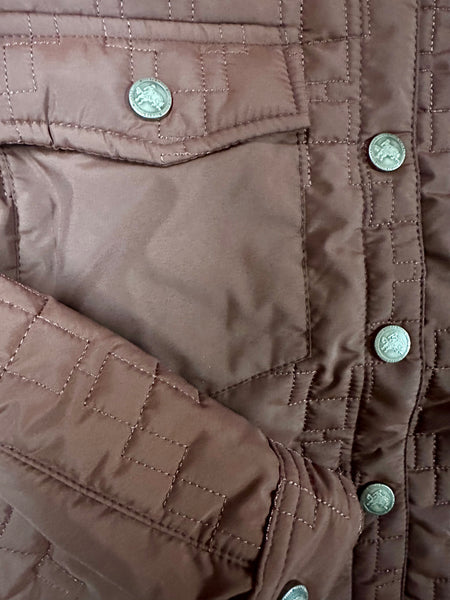 Crafted for warmth and style, this lightweight puffer jacket features a modern geometric quilted stitch pattern throughout and is finished in a rich rust tone perfect for the seasonal palette. Western-inspired snap buttons with engraved longhorn details add rugged charm, while functional chest flap pockets and a structured collar provide timeless appeal. This jacket is an essential layering piece for cowgirls looking to stay warm without sacrificing their Western flair.