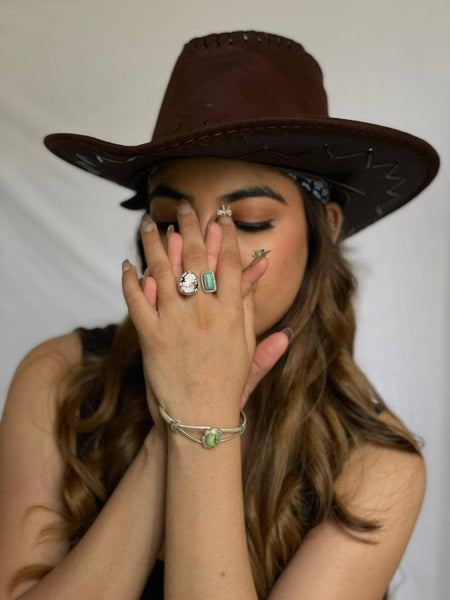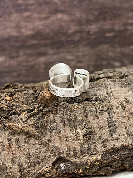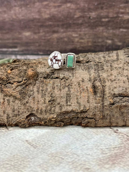 Introducing our latest masterpiece! This stunning Sterling Silver Wild Horse Magnesite with Kingman Turquoise adjustable ring is a true showstopper. With dimensions of 1" in length and 6/8" in width, it’s designed to make a bold statement. Actual colours may vary slightly due to lighting, screen display and/or the way colour is seen by an individual.